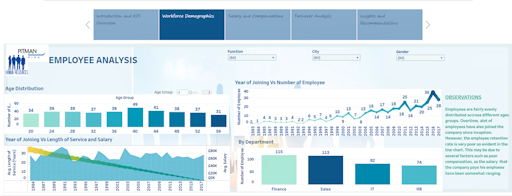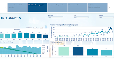 The dashboard covers multiple aspects such as age distribution, employee tenure, salary by department, and employee turnover. Interactive filters for function, city, and gender allow users to customise the analysis for targeted insights. Visualisations include bar charts, line graphs, and area charts that explore relationships between employee age, length of service, and compensation trends over time. With clear observations and data-driven insights, the dashboard helps HR professionals identify workforce patterns and develop effective strategies for talent management and retention.