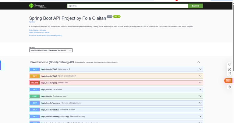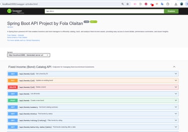 A Spring Boot REST API project for managing and analyzing bonds — fixed-income financial instruments, enriched with real-time exchange rate/currency conversion and macro economic data (such as GDP and Inflation) via external APIs. This project is designed by Fola Olaitan as part of a software engineering bootcamp with enterprise-grade best practices in Spring Boot, JPA, MySQL/H2, Swagger/OpenAPI, exception handling, and testing (JUnit5, Mockito, Testcontainers, JaCoCo).